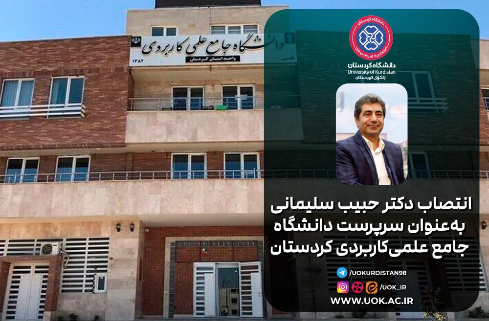 به گزارش روابط عمومی دانشگاه کردستان، دکتر محمدعلی اکبری، رئیس دانشگاه جامع علمی‌کاربردی کشور، طی حکمی دکتر حبیب سلیمانی، عضو هیأت علمی دانشگاه کردستان را به سمت سرپرست دانشگاه جامع علمی‌کاربردی استان کردستان منصوب کرد.